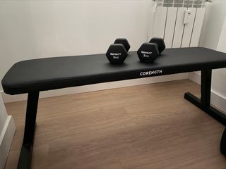 Banco de musculación plano con dos mancuernas de 3kg cada una. Plegable y soporte hasta 200kg. - Banco de color negro. - Mancuernas recubiertas. - Marca: CORENGTH
