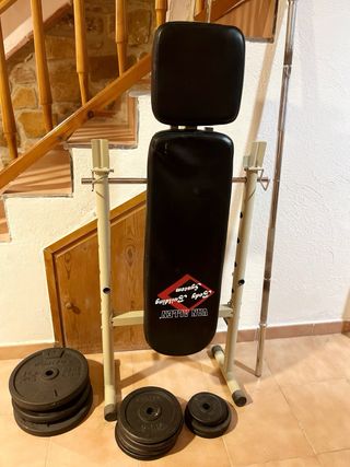 Equipo de gimnasio completo para entrenar en casa. Incluye banco de musculación, juego de mancuernas, barra larga y discos de pesas. - Banco con respaldo acolchado plegable como se puede apreciar en la foto. - Mancuernas con agarre. - Pesas de diferentes tamaños: 8 discos de 2kg. 8 discos de 1kg.