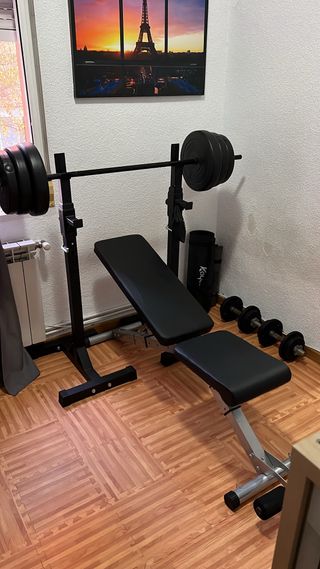 Banco de pesas plegable con barra y discos. - Banco con respaldo ajustable. - Barra de pesas incluida. - Discos de pesas de diferentes tamaños. - El soporte de la barra se eleva para hacer ejercicios de pierna también. MANCUERNAS NO INCLUIDAS! EL SUELO SE INCLUYE POR 20 EUROS MÁS !