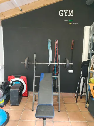 Se vende equipo de gimnasio completo, ideal para entrenar en casa. Montado en habitación de 4x3 m con suelo de caucho - Banco plano e inclinado ajustable y plegable - Barra de dominadas con agarres múltiples. - Bandas de resistencia - Discos de pesas de varios tamaños.80 KG APROX - Máncuernas y muchos adicionales. Se puede ver en foto. NO VENDO NADA SUELTO.