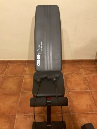 Banco de musculación Decathlon plegable, ideal para entrenar en casa. Permite diferentes posiciones para trabajar pesas y abdominales. - 4 inclinaciones (0, 30, 45 y 80°). - 2 posiciones de asiento. - Altura plegado: 19 cm. - Carga máxima: 220 kg (usuario + cargas). - Talla única. A recoger en San Valentín, Fene
