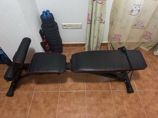 Banco de abdominales plegable y reclinable hasta 6 posiciones. Peso máximo soportado 200kg. (Tiene el protector con el que se compró) -2 barras de 2 kg, de 35 cm de largo y 28 mm de diámetro. - 1 barra de 155 cm de 7,8 kg - 4 discos de hierro fundido de 5 kg - 8 discos de hierro fundido de 2 kg - 4 discos de hierro fundido de 0,5 kg -3 pares de bloqueadores de disco