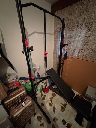 NO ESTA EN CANARIAS. NO SE HACEN ENVÍOS. Equipo de gimnasio completo para entrenar en casa. - Barra de dominadas. - Banca de ejercicios con respaldo acolchado y reclinable. - Juego de pesas con barras y discos. Dos barras cortas Una barra larga con ángulo. Dos discos de; 5Kg Cuatro discos de; 1'25Kg 2Kg Se le ha dado poco uso, se han lavado y guardado.