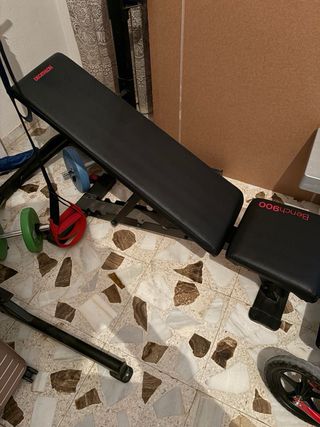 Banco de musculación para entrenamientos de fitness en casa. Incluye un juego completo de pesas. - Tapicería gris. - Estructura robusta. reclinable varias posiciones marca domyos también incluyo barras, juegos de pesas, mancuernas pequeñas y un montón de cosas maletín completo de la marca Domyos incluye 2pesas de 10 kilos ,4 de 5kl ,10de de 2kl 8 de 1 kilo 4. de 1/2 kilo + 2 mancuernas exagonales 7kilos el kit muy completo también regalo fitgriff nuevo