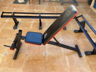 Banco de musculación prácticamente nuevo. Reclinable en varias posiciones. Muy buen estado. Incluye también 2 mancuernas, 1 barra y los discos: 4 discos de 2kg 4 discos de 4kg 2 discos de 5kg 2 discos de 10 kg No leer: Gym gimnasio fitness banco musculación pesas discos barra mancuerna decathlon