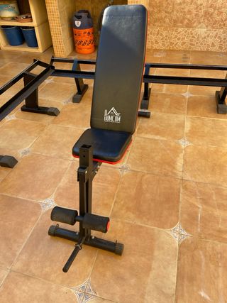 Banco de Pesas / Banco de Musculación Multifuncional con Respaldo Reclinable y Altura Ajustable para Entrenamiento Fitness en Casa. Marca HOMCOM 210x110x103-123 cm color negro. Está en muy buen estado. Incluye lo que se ve en la primera foto, sin barra y sin pesas.