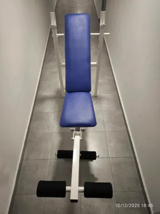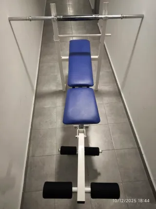 Banco de pesas reclinable, para ejercicios de pres banca y piernas. Barra larga y dos barras pequenyas para montar mancuerna. Incluye: -Discos 10kg x 2 5kg x 6 2kg x 3 4 quadrados de espuma para el suelo. 6 pinzas para los discos en barra. Cuerda para saltar