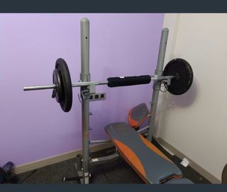 Equipo de gimnasio para entrenar en casa. -Discos: 2x5kg y 2x3kg - Banco de press banca. - Par de barra de mancuerna con empalme - Discos de pesas con un total de 16kg.