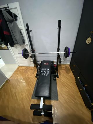Banco de pesas con barra y discos para entrenar en casa. Ideal para ejercicios de fuerza. 30kg de discos. - Barra de pesas incluida. - Discos de diferentes pesos. - Banco con respaldo ajustable. Palabras clave: gimnasio, gym, domyos, decathlon, pesa, pesa rusa, kettlebel, mancuerna, disco, peso, halterofilia, barra, cierre, pinza, barra, dominadas, gervasport, tentable, 25mm, 28mm, 30mm, 50mm, barra romana, barra h, barra z, zeta, banco, press, banca, discos de peso, discos, curl, bodypump, 1kg, 2kg, 5kg, 10kg, 20kg, olímpica, olímpico.