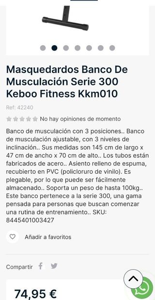 Banco de musculación con 3 posiciones.. Banco de musculación ajustable, con 3 niveles de inclinación.. Sus medidas son 145 cm de largo x 47 cm de ancho x 70 cm de alto.. Los tubos están fabricados de acero.. Asiento relleno de espuma, recubierto en PVC (policloruro de vinilo). Es plegable, por lo que puede ser fácilmente almacenado.. Soporta un peso de hasta 100kg.. Este banco pertenece a la serie 300, una gama pensada para personas que buscan comenzar una rutina de entrenamiento