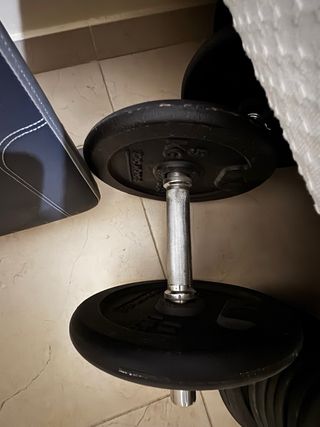 Conjunto fitness Home compuesto por; Mueble-oeganizador para discos y barras #1 barra olímpica de 1,75 m (160 kg de carga máxima), #3 barras macizas de 35 cm de largo de 2 kg #10 cierres #6 discos de 10 kg #4 discos de 5 kg #8 discos de 2 kg y 4 discos 1 kg #2 soportes para hacer flexiones #1 banco de trabajo de decathlong sin uso y montado REGALAMOS 🎁🎁 #Esponjas para poner las barras #Silla romana o banco de dominadas desmontado A recoger / No envío (No entra ; las 2pesas rusas, las 2 mancuernas pequeñas y las tobilleras que aparece en la foto ) NO VENDO POR SEPARADO!!