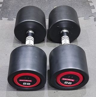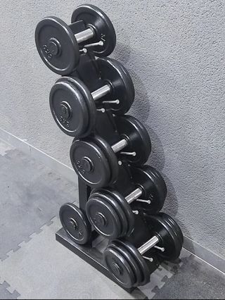 Par de mancuernas de 22 kg cada una, son de metal cubierto de goma. Palabras clave: Discos, powerlifting, pesas, banco, barra, mancuerna, fit, bodybulding, fitness, crossfit, dechatlon, multifuncion, máquina, polea, jalón, fitness, bodypump, musculacion, ejercicio físico, oportunidad, oferta, Domyos, Salter.