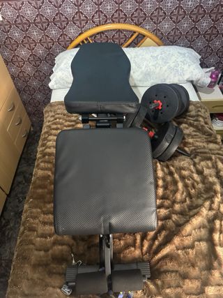 Banco de gimnasio con un diseño moderno y funcional. Ideal para entrenamientos en casa con mancuernas ambos los compre por separado pero como ya retorne a valencia del pueblo donde no habia gym pues ahora lo estoy vendiendo el cuero de la silla esta en muy buenas condiciones no tiene ningun rasguño como en las fotos y las pesas suman 30 k en total 15 k en cada mancuerna. - Tapicería con acabado de carbono. - Estructura robusta. He intentado ponerlo para envio pero son dos paquetes que superan los 30k que pone como max la app asi que ahora esta para que lo recojan de casa preferiblemente venir con coche por los 30k de las mancuerna