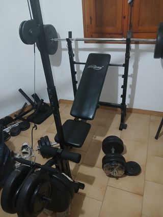 Se vende equipo de gimnasio completo. - Banca de entrenamiento. - Juego de pesas. - Mancuernas.