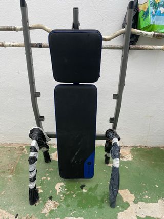 Banco de pesas para hacer ejercicio en casa. Está en buen estado, aunque algo usado. - Incluye dos tipos de barras. - Estructura robusta. - Con 70kg de peso