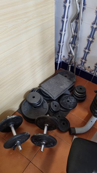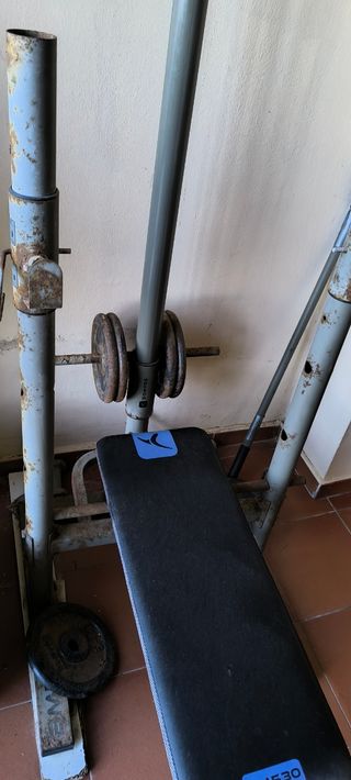 💪🏼Gimaniso en casa💪🏼 pack de entrenamiento en buen estado: ✅️ Banco de musculación DOMYOS. (Medidas 120cm largo x 35cm ancho x 50cm alto) Peso: 20kg Incluye: •Barra(220x30mm) + 2 seguros antideslizantes •4 discos DOMYOS de 5kg (20kg en discos) - Perfecto para realizar ejercicios de fuerza. - Estructura resistente y estable. - Fácil de montar y desmontar. ✅️ Banco de abdominales plegable Tentable Home Fitness •Compacto y fácil de guardar Peso: 10kg 👉En total, el pack ronda 60kg de material sólido y resistente para entrenar fuerza y core desde casa sin pagar mensualidad en el Gym. 🔥Precio de chollo🔥
