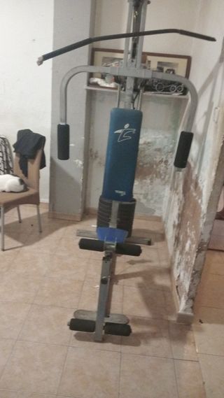 Máquina de pesas para hacer ejercicio en casa. Está en buen estado, aunque algo usado. - Perfecta para realizar diferentes ejercicios. - Estructura resistente y estable. - Incluye banco y barra.