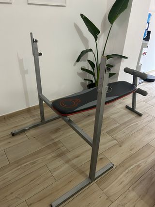 Equipo de gimnasio para entrenar en casa. - Banco acolchado con detalles en naranja. - Estructura metálica gris. - Soportes para barra. Press banca, abdominales, se puede hacer de todo. Tiene algo de óxido pero con cualquier producto se quita en un momento.