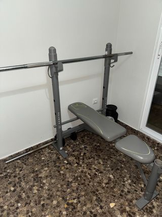 - Banco (Se puede inclinar o plegar) 30 cm de ancho y alrededor de 110cm de largo. - Rack regulable (Altura mínima 75 cm y máxima 120 cm) - Barra de 2 metros de longitud y 10 kg de peso - 6 Discos de 10 kg cada uno (60 Kg en total) - 2 Fijadores para sujetar los discos en la barra. Vendo todo junto, no partes por separado