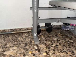 Banco de pesas Weider Santonja, ideal para realizar ejercicios de fuerza. Se encuentra en buen estado. - Perfecto para entrenamiento en casa. - Estructura resistente y estable. - Incluye barra y pesas, 2 de 10kg y 4 de 5kg. -No se envía. Sólo recogida.