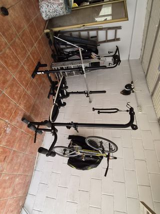 Banco de pesas y soporte en buen estado. Ideal para entrenar en casa. - Incluye banco de pesas con respaldo y soporte para piernas y curl Scott. - Rack para Press Banca, Remos, Sentadilla... - Step con dos alturas - Barra de 1'70 con cierres. - Set para recoger pesos y barras. - Discos para peso libre: - 2x25Kg de hierro fundido. - 4x10kg de plástico y arena. - 4x5 kg de plástico y arena. - 2x5 kg de hierro fundido. - 4x2kg de hierro fundido. - 4x1kg de hierro fundido. - 4 Mancuernas para añadir discos con sus cierres. - Suelo blando para gimnasio formato loseta. Precio negociable por partes.