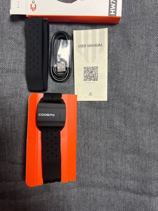 Sensor de frecuencia cardíaca Coospo HW706. - Incluye dos bandas elásticas, una sin usar y otra con poco uso - Incluye cable de carga. - Incluye sensor.