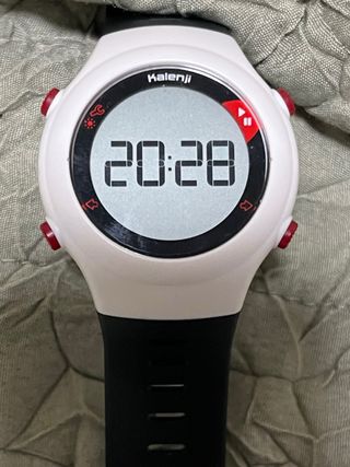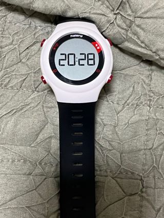 Reloj deportivo Kalenji con monitor de frecuencia cardíaca. Monitor de frecuencia cardiaca compuesto por reloj de pulsera y banda para el pecho que se comunican de manera inalámbrica. Mide el ritmo cardíaco en pulsaciones por minuto (ppm). También dispone de cronómetro, hora, fecha, alarma y retroiluminación. Resistente al agua para poder practicar natación. En perfecto estado y funcionando correctamente.