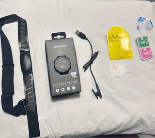 Reloj GPS Garmin Forerunner 235 con banda cardiaca. Realiza un seguimiento de la distancia, el ritmo, el tiempo, la frecuencia cardiaca Funciones de conexión:cargas automáticas a Garmin Connect, seguimiento en tiempo real, notificaciones inteligentes y capacidad para compartir en redes sociales .Descarga campos de datos pantallas para el reloj, widgets y aplicaciones de Connect IQ, batería en buen estado,apenas marcas de uso, en general muy buen estado, ,siempre con protector de pantallacon cargador. - Incluye banda cardiaca premium. - Cable de carga USB. - 2 protectores de pantalla. - Manuales del reloj y de la banda