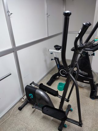 Bicicleta elíptica de color gris y negro, ideal para entrenamientos en casa. - Diseño moderno. - Pedales amplios. - Manillar ergonómico.