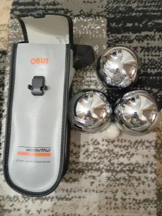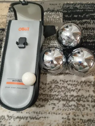 Set de tres bolas de petanca OBUT de metal cromado, con una bola de tiro blanca. - Incluye funda de transporte. - Diseño clásico y elegante.