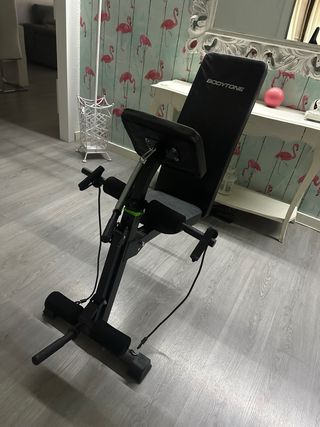 Banco de musculación de la marca BODYTONE, ideal para entrenamientos en casa. - Diseño robusto y compacto. - Tapicería negra. - Incluye soportes para ejercicios.
