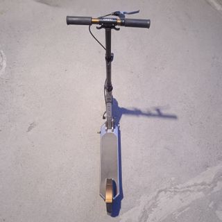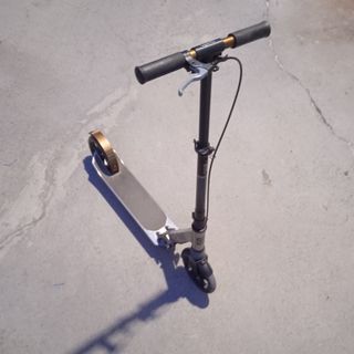 Patinete plegable con manillar ajustable. - Ruedas de color dorado. - Plataforma gris. - Freno en el manillar.
