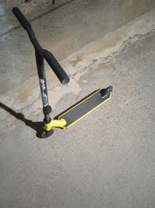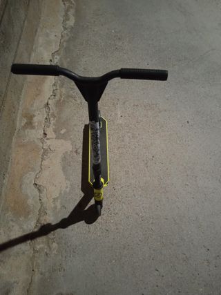 Patinete de estilo freestyle con un diseño llamativo en negro y amarillo. - Manillar negro con puños texturizados. - Plataforma con detalles gráficos. - Ruedas amarillas.