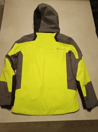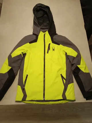 Chaqueta de esquí Spyder con un diseño llamativo en colores amarillo neón, gris y negro. Ideal para actividades en la nieve. - Cremallera frontal completa. - Bolsillos frontales con cremallera. - Capucha integrada.