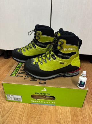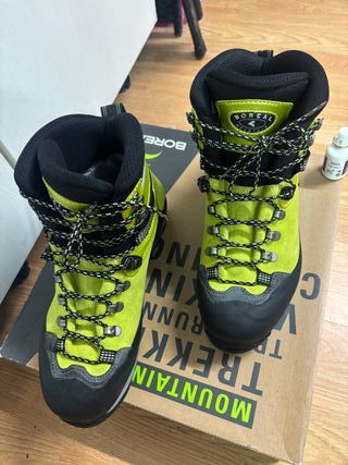 Botas de montaña de mujer Boreal en color verde lima y negro. NUEVAS. Alpinismo y senderismo/trekking. Número 40 (6 1/2). - Diseño robusto para alpinismo y trekking. - Cierre con cordones. - Suela vibram. - Incluye caja original y spray protector.