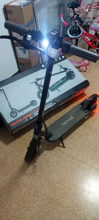Patinete eléctrico Denver en color negro, con capacidad de carga de hasta 120 Kg. - Diseño moderno y funcional. - Manillar ajustable en altura. - Ruedas para un desplazamiento suave.