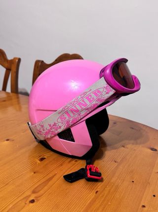 Conjunto de casco y gafas de esquí en color rosa, ideal para niñas. - Casco de esquí rosa con detalles. - Gafas de esquí Sinner con lente roja de ventisca. - Correa ajustable con cierre de seguridad.