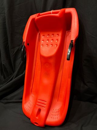 Trineo de plástico rojo para deslizarse en la nieve. - Diseño ergonómico para mayor comodidad. - Asas laterales para un mejor agarre. - Resistente y duradero.