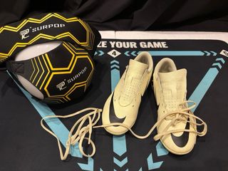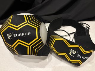 Equipo de entrenamiento de fútbol marca SURPOP. - Diseño con patrón hexagonal en negro y amarillo. - Incluye correa ajustable con velcro.