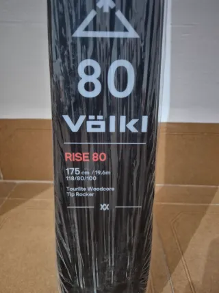Esquís de travesía Völkl Rise 80 en perfecto estado. Diseñados para ofrecer un rendimiento versátil en diferentes condiciones de nieve. - Longitud: 175 cm - Cotas: 118/80/100 - Construcción: Tourlite Woodcore - Perfil: Tip Rocker