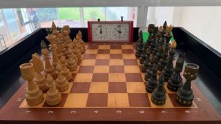 Set de ajedrez de madera con tablero. - Piezas de madera de color blanco y negro.