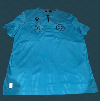 Camiseta de árbitro Macron en color azul, talla M, con el escudo de la RFEF. - Diseño oficial de árbitro. - Logo de Macron. - Tejido técnico.