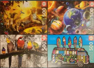 Pack de cuatro puzzles de 500 piezas de la marca Educa. Todos completos y en perfecto estado. - Puzzle " Leopardo con sus crías" - Puzzle "Sistema solar" - Puzzle "Pájaros en la jungla" - Puzzle "California Dreaming"