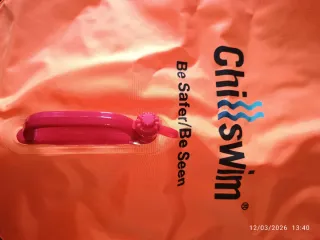 Boya de natación de 28 litros en color naranja brillante, diseñada para ser vista en el agua. - Material resistente. - Asa para facilitar el transporte. - Cierre seguro.