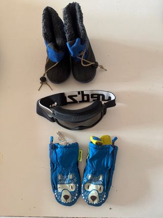 Conjunto de ropa y accesorios para esquiar, ideal para niños de 2 a 3 años. - Botas de invierno con forro interior. - Gafas de esquí con correa ajustable. - Manoplas azules con diseño de oso.