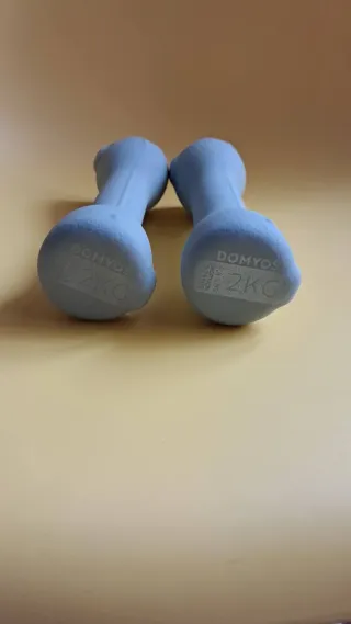 Par de mancuernas de la marca DOMYOS, ideales para fitness y entrenamiento en casa. Color gris. - Peso: 2 kg cada una. - Diseño ergonómico para un agarre cómodo. - Revestimiento que protege el suelo. - Precio original 22.99€ 📍Se retira en Poble Sec, cerca del metro Poble Sec.