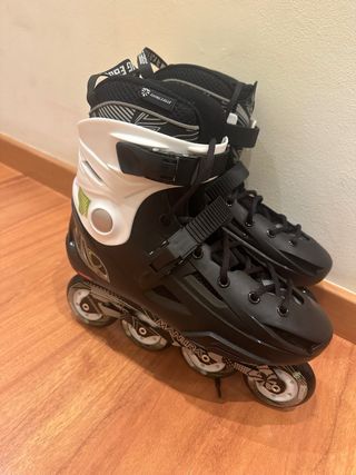 Patines en línea de color negro, perfectos para desplazarse con agilidad. - Diseño moderno y funcional. - Cierre de velcro y cordones para un ajuste seguro. - Ruedas de alta resistencia.