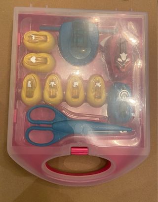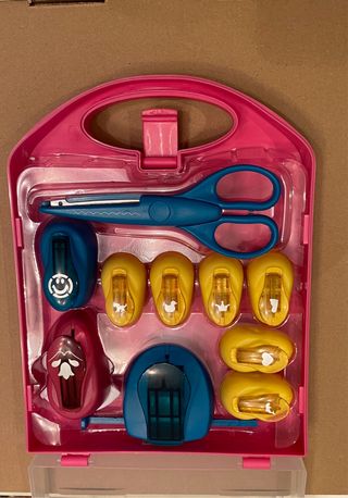 Maletín de plástico rosa con herramientas para manualidades. - Tijeras de punta redonda con borde decorativo. - Troqueladora azul con cara sonriente. - Cuatro troqueladoras amarillas con figuras de animales y coronas. - Troqueladora roja con forma de campana. - Troqueladora azul con forma de casa. - Dos troqueladoras amarillas con forma de corazón y pájaro.
