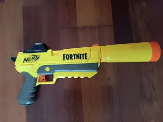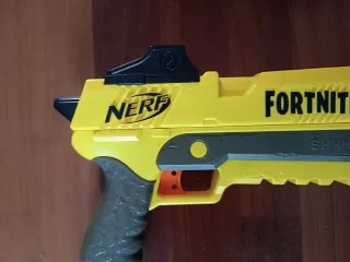 Pistola de juguete Nerf inspirada en Fortnite. Diseño llamativo en color amarillo. - Marca Nerf. - Temática Fortnite. - Incluye silenciador.