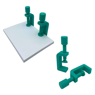 Set de dos prensas en C de color verde azulado, ideales para sujetar materiales. Su diseño permite un ajuste firme y seguro. - Fabricadas en plástico resistente. - Tornillo de ajuste con rosca. - Color verde azulado.